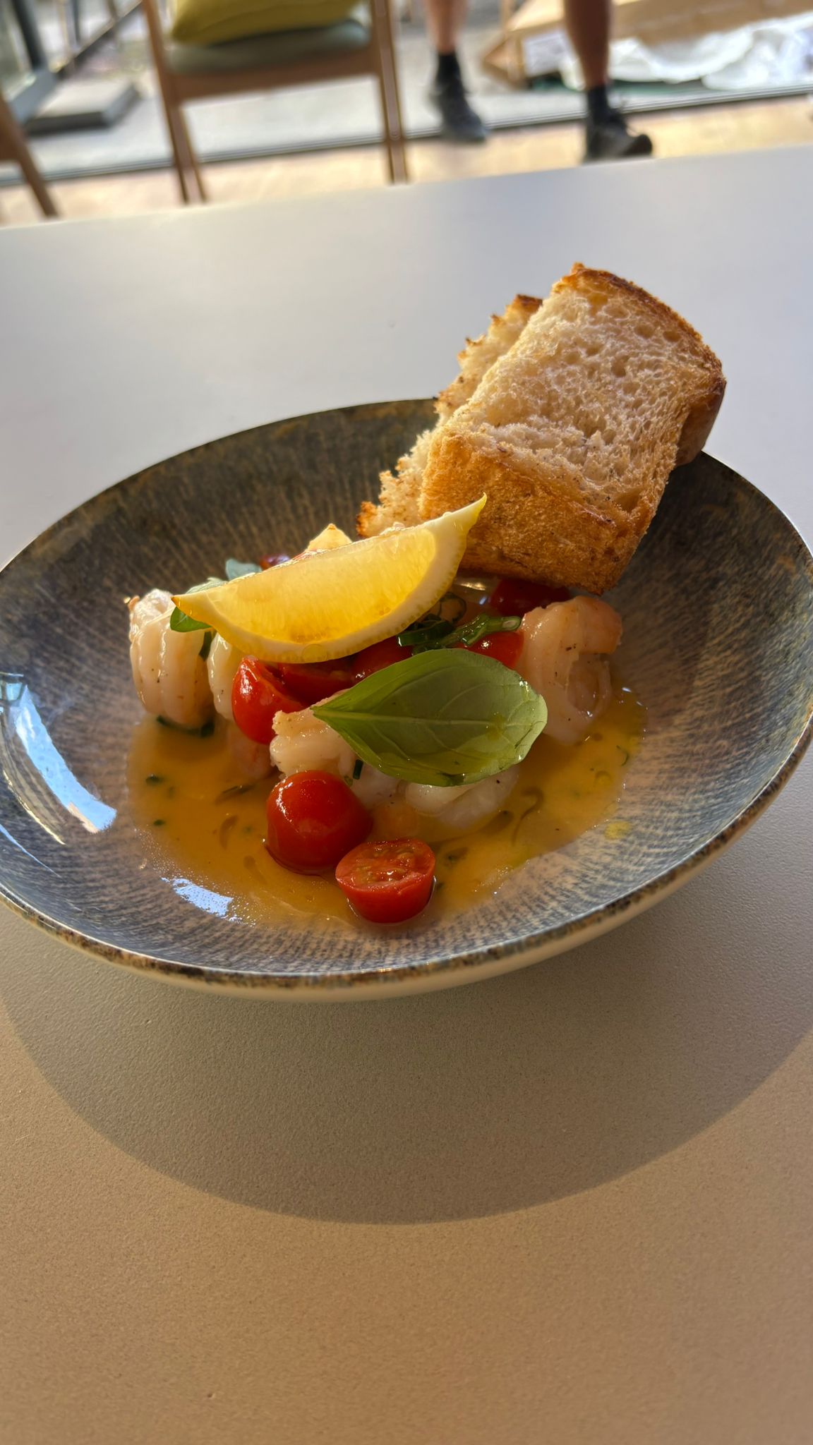 grillowane krewetki / mix sałat / liście szpinaku / czerwona cebula / kiełki / sos mango chilli / czarnuszka / pieczywo czosnkowe