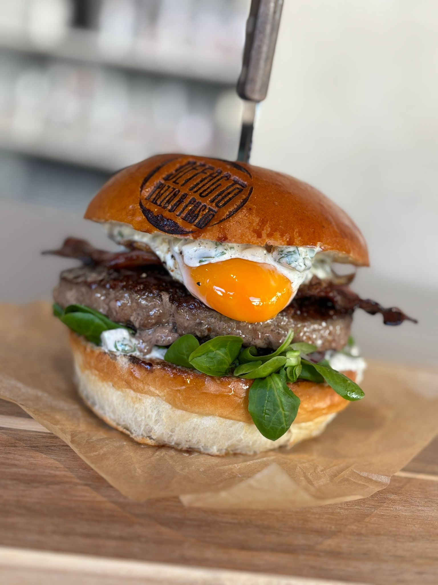 bułka maślana, wołowina 200g, sadzone jajko, roszponka, czerwona cebula, dip tatrski, bekon
