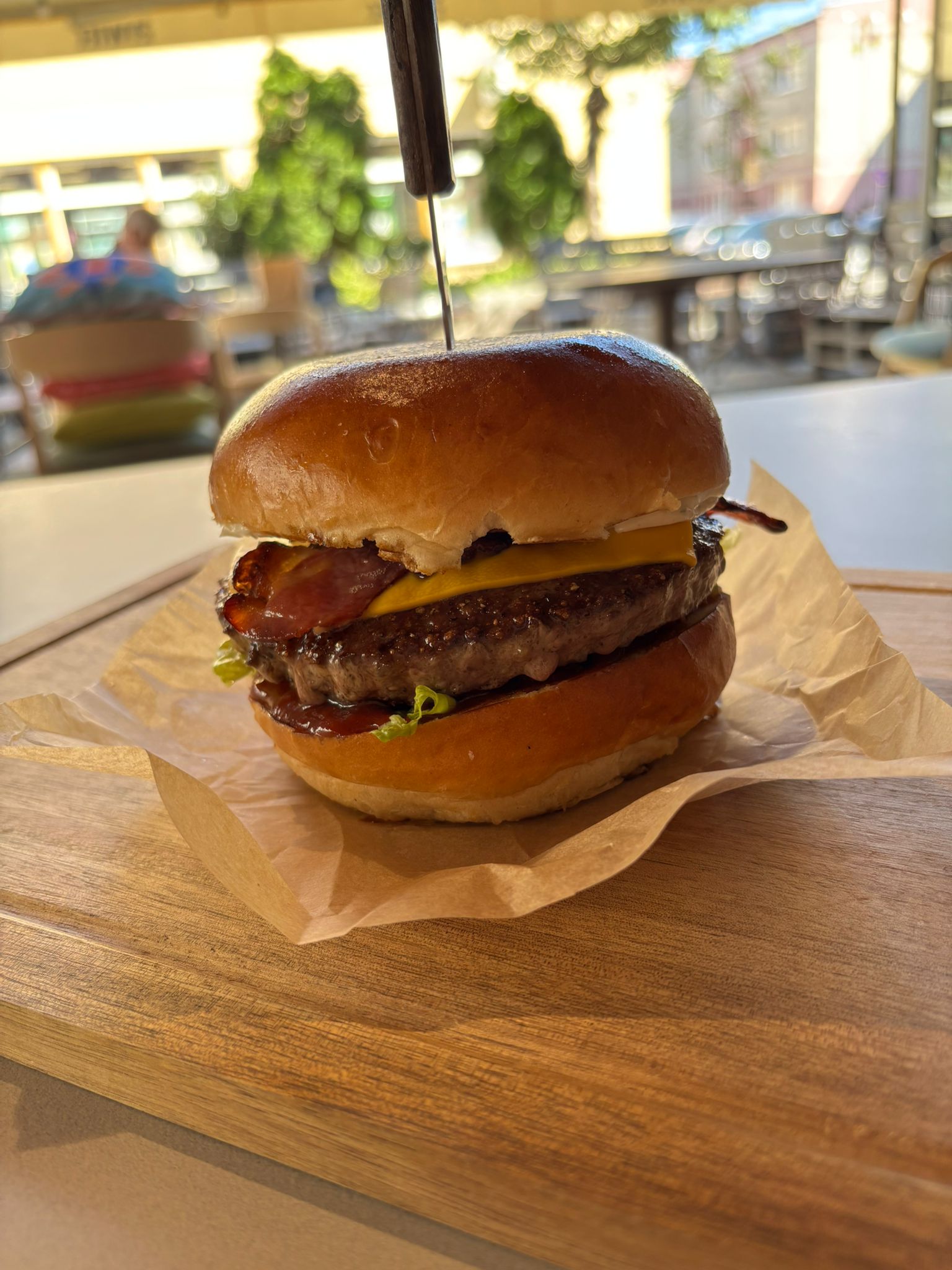 bułka maślana, wołowina 200g, cheddar, bekon, sałata rzymska, sos aioli, piklowany ogórek